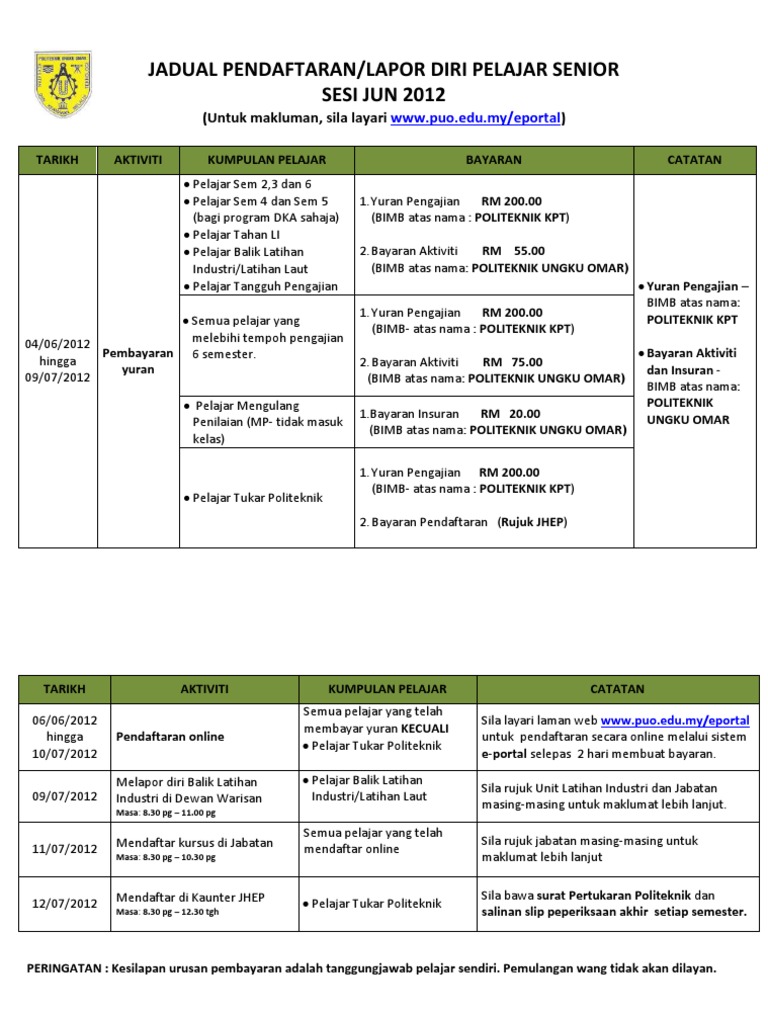 Bayaran pendaftaran politeknik ungku omar. Politeknik sijil modular kolej komuniti sijil ikm sijil kemahiran kursus bayaran 1 bayaran 2 bayaran 3 sila rujuk kod kursus pada surat tawaran yuran pengajian yuran asrama jika ditawarkan bayaran pendaftaran dka dsb dgu dtk dep dee dkm dad dat dsk dec dls rm6000 dtm dmh rm20000 rm60000 ipp ips. Politeknik Ungku Omar Jalan Raja Musa Mahadi 31400 IPOH PERAK TuanPuan PERMOHONAN PEMULANGAN BAYARAN KONVOKESYEN KALI KE 46 2017 Dengan segala hormatnya saya merujuk kepada perkara di atas. Peruntukan sebanyak RM245 juta diperolehi daripada Program Pembangunan PBB UNDP.