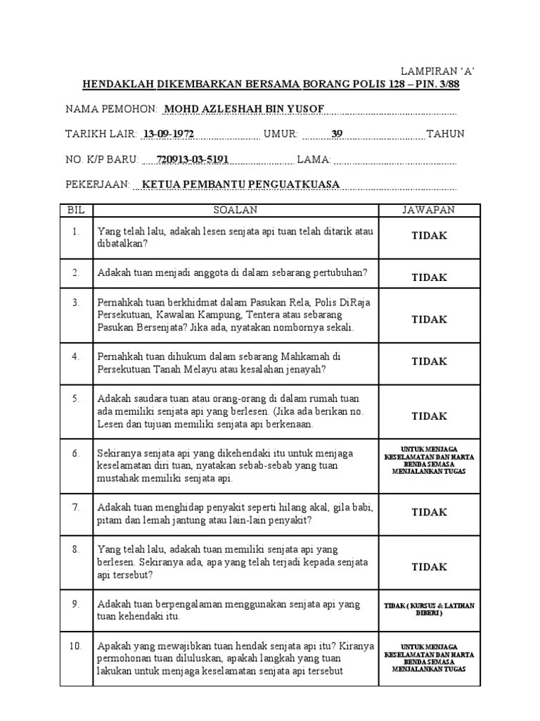 Lampiran A Hendaklah Dikembarkan Bersama Borang Polis 128 Pin 3 88 Nama Pemohon Tarikh Lair Umur Tahun No K P Baru Pekerjaan Pdf Free Download. Ni dia detail tentang permohonan untuk senjata api. Jenis senjata api diberikan kepada orang yang memenuhi persyaratan dengan diberikan jenis senjata sebagai berikut.