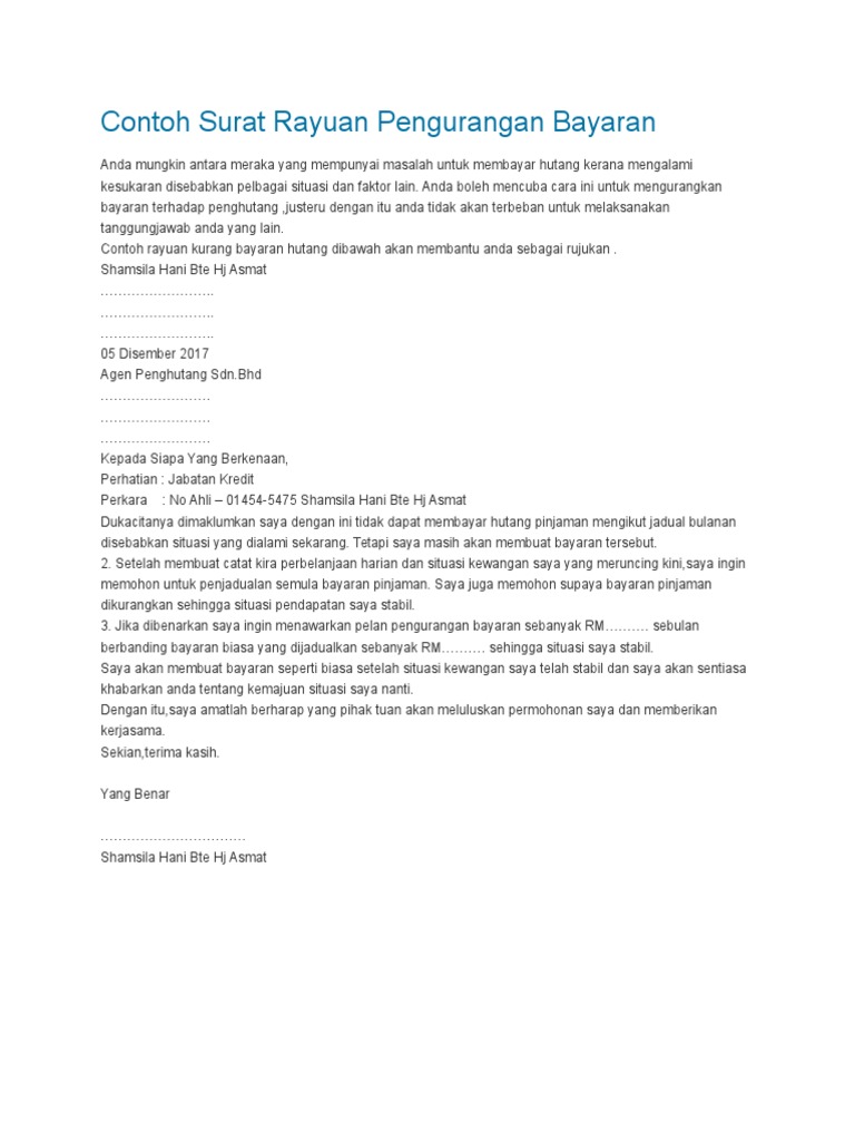 Anda boleh mencuba cara ini untuk mengurangkan bayaran terhadap penghutang justeru dengan itu anda tidak akan terbeban untuk melaksanakan tanggungjawab anda yang lain. Surat Rasmi Permohonan Haji. Contoh Surat Rayuan Pengurangan Bayaran Akpk.
