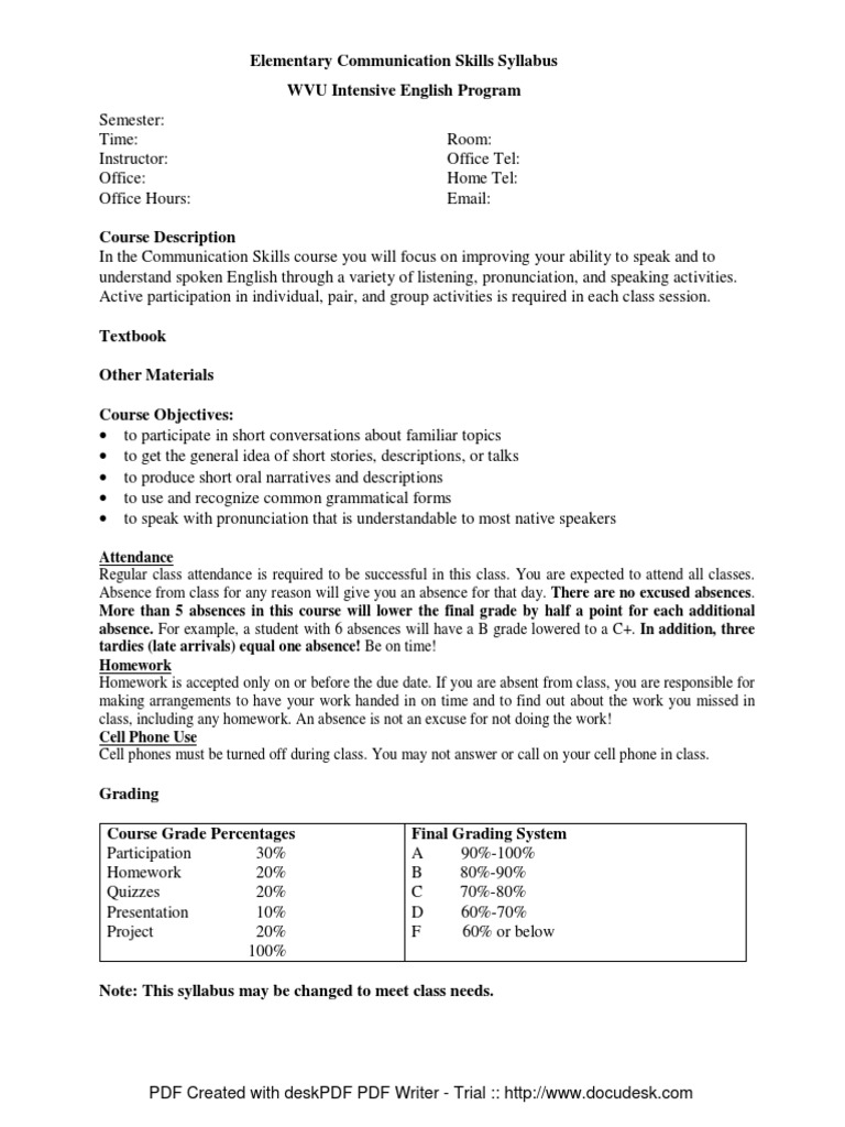 Although the course syllabi are designed primarily for Student Teachers they are useful resource for teacher educators too. ENGLISH FOR EFFECTIVE COMMUNICATION SYLLABUS B A S I C L E V E L Course Length. In addition participants in the workshops developed elements of a course guide.