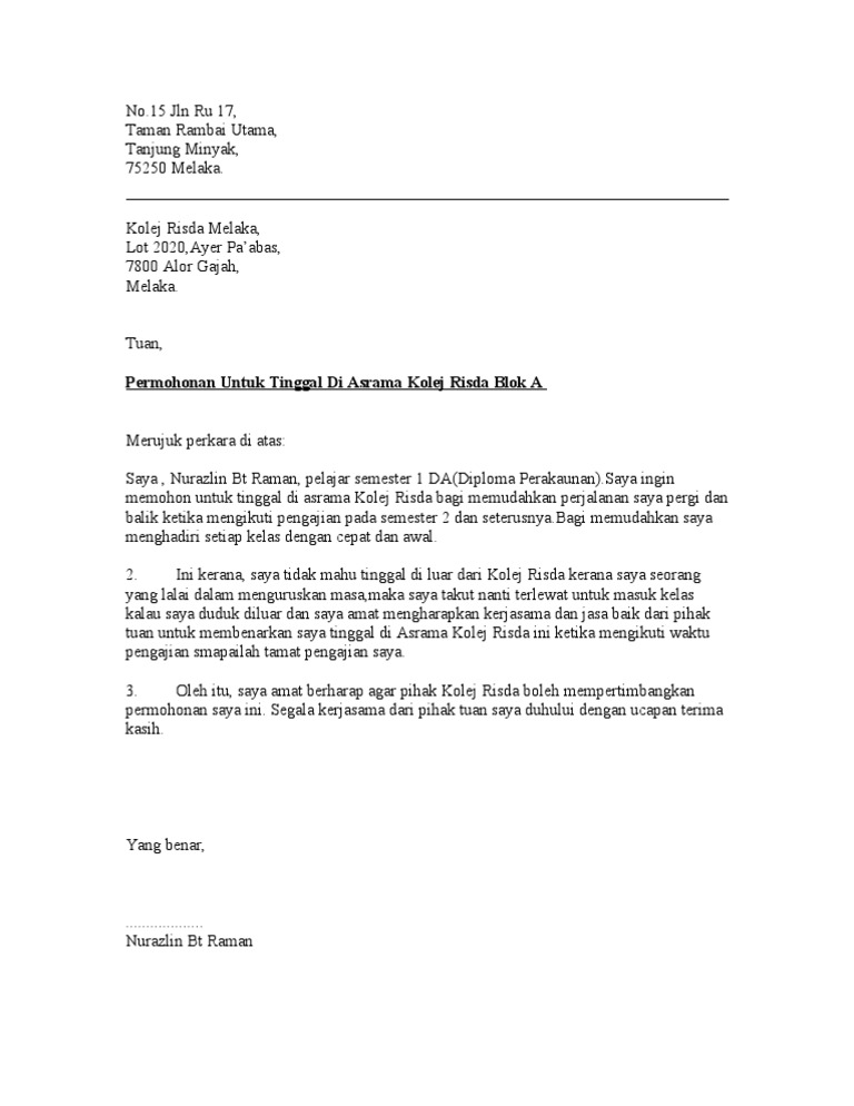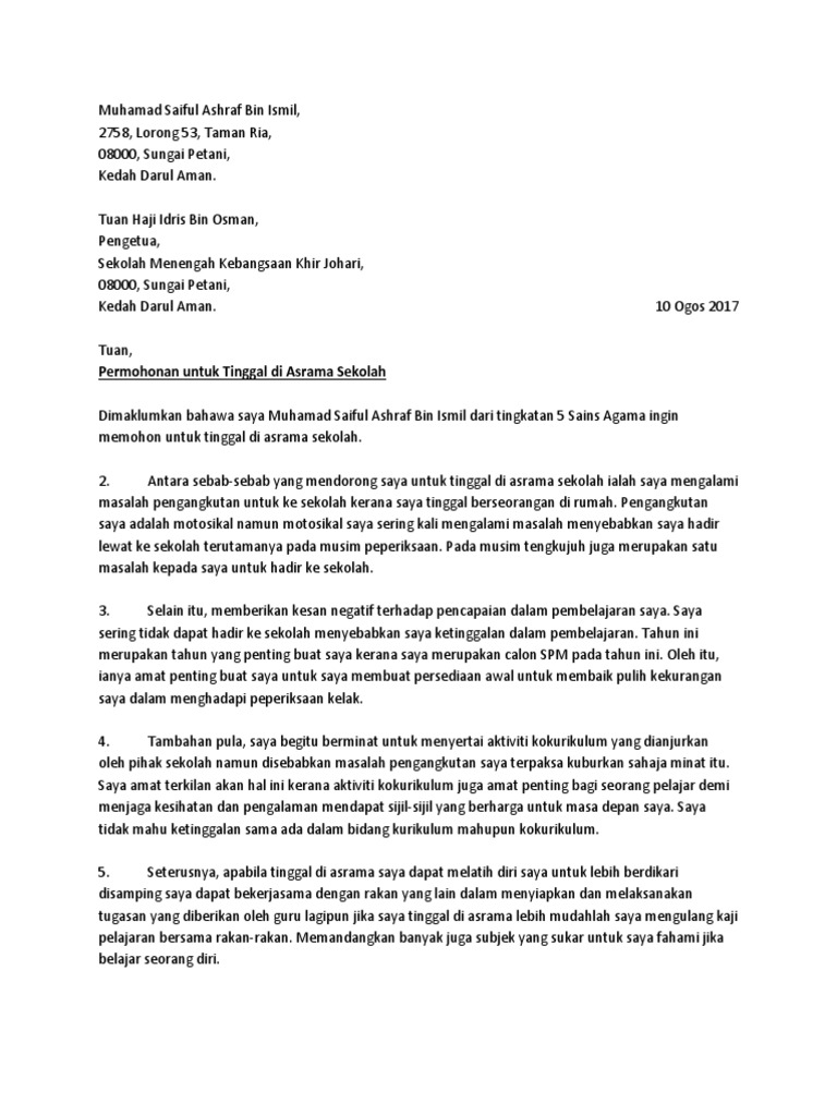 Contoh Surat Rasmi Rayuan Untuk Tinggal Di Asrama - Pengetua sekolah menengah kebangsaan jitra 06000 jitra kedah darul aman 8 mac 2008 tuan memohon untuk tinggal di asrama sekolah dimaklumkan bahawa saya seperti nama clan alamat di atas iaitu pelajar tingkatan empat megah ingin memohon untuk tinggal di asrama sekolah. Related posts to surat rasmi rayuan tinggal di asrama surat rasmi rayuan tinggal di asrama 2018 09 09t10 16 00 07 00 rating.
