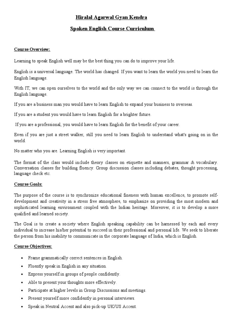Scribd is the worlds largest. The syllabus has been designed to help the pupil to. Certificate Course in Spoken English refers to the basic language specialisation program in English which is designed to enable the learners to cope with daily situations.