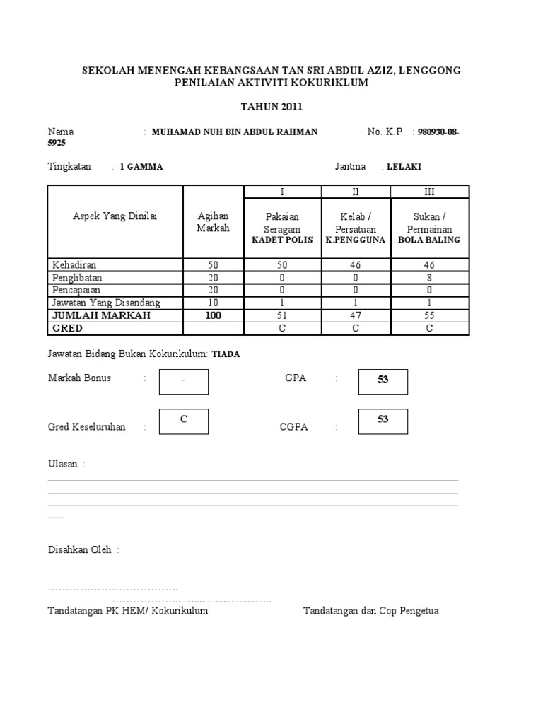 Assalam untuk sekolah rendah markah 3 tahun boleh dimasukkan untuk cari CGPA untu 3 tahun. Borang Anugerah Kokurikulum 2013. Pentaksiran kegiatan kokurikulum yang dibuat oleh sekolah didapati berbeza-beza antara satu sama lain.